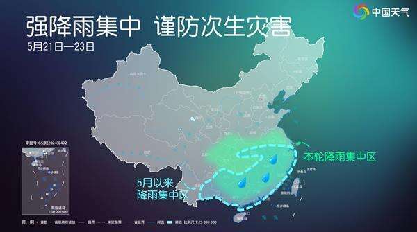 暴雨成片!南方今天(5月21日)至24日将遭遇新一轮较强降雨过程,明天将是本轮过程的最强时段,安徽、湖北、湖南、江西、广西等地部分地区有暴雨,局地大暴雨,并且伴有强对流天气,部分地区6小时降雨量将达60毫米以上,局地甚至可达120毫米以上。此轮强降雨区域与前期降水偏多区域重叠度高,公众需防范地质灾害、山洪等次生灾害。