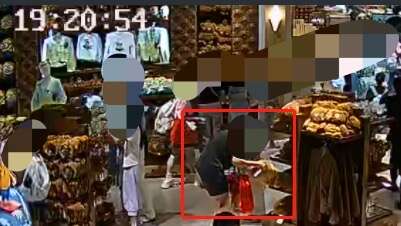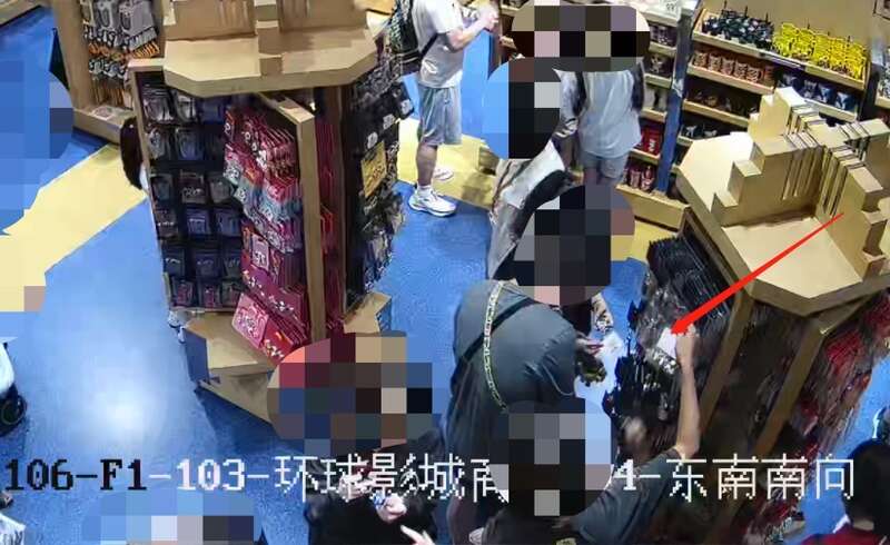 王某某偷窃环球影城周边商品现场。(公共场所视频截图)北京市通州区人民法院供图