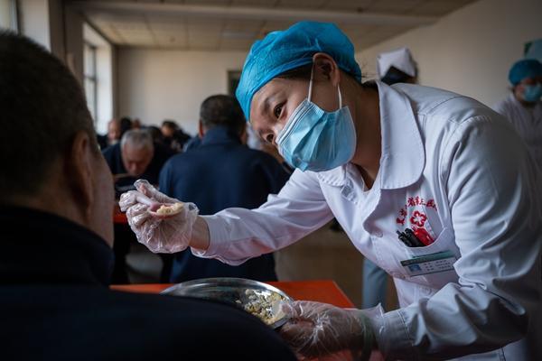 5月7日,一名精神科病房护士正在为患者喂饭。防止患者噎食,是护士的一项重要工作。