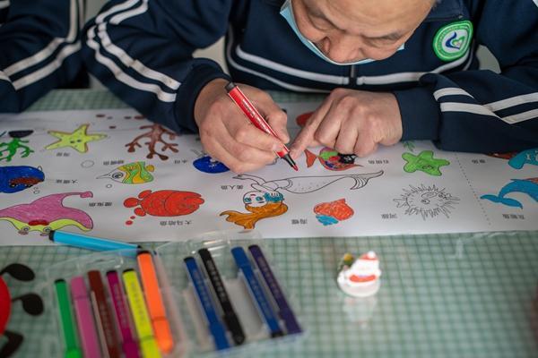 5月8日,在医院工娱疗室,患者在精神科病房护士指导下画画。