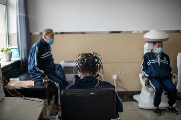 5月8日,精神科患者在护士辅助下,接受脑涨落图仪检查。