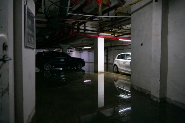 2025年5月22日,湖北省武汉市,暴雨造成地下停车场积水。