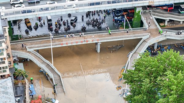 2025年5月22日,湖北省武汉市,武汉暴雨造成雄楚高架石牌岭岭南路积水,火车桥洞底下积水达到2.5米,严重影响BRT公交车无法行驶。