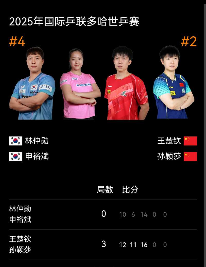 2024年巴黎奥运会,王楚钦/孙颖莎就在逆转战胜林仲勋/申裕斌之后晋级决赛,因此具有一定的心理优势。今天的比赛,林仲勋/申裕斌在开场阶段冲得很凶,比分一度领先。但王楚钦/孙颖莎逆转拿下首局之后,林仲勋/申裕斌失去主动。第三局尾声阶段,双方再次展开激烈拼杀,一直打到16:14,王楚钦/孙颖莎最终取胜。