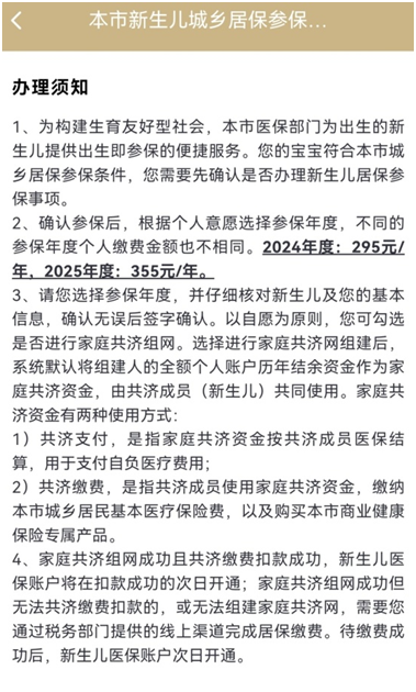 值得一提的是,选择家庭共济组网功能的新生儿父母,新生儿参保通过共济缴费自动扣款,最快隔日开通居保账户。新生儿出生后,就能够享受居保待遇,直接就医或报销医药费用。家庭共济无法组网或组网后共济缴费扣款失败的,家长需要通过税务部门提供的线上、线下渠道完成居保缴费。待缴费成功后,新生儿医保账户次日开通。