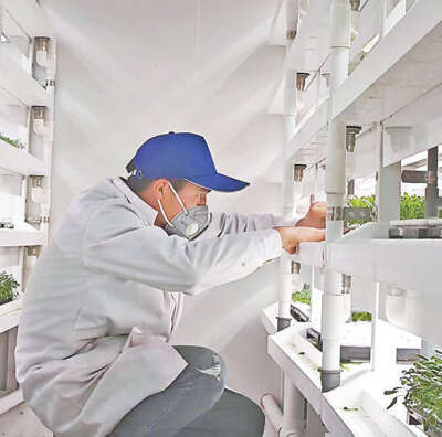 库车市甬库同心村智慧农业植物工厂育苗室内,工作人员在仔细观察幼苗。王红丽摄