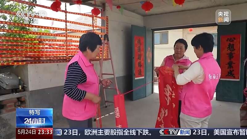 距离儿子的婚礼还有三天,三河埠村村民魏祥年家里已经忙碌起来。陪着老魏夫妇一起忙活的,除了亲友,还有好几位穿着粉色志愿服务马甲的大姐。
