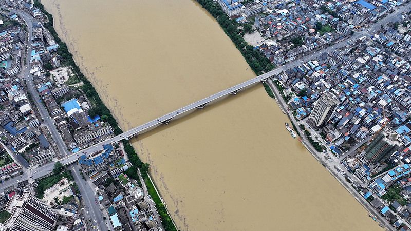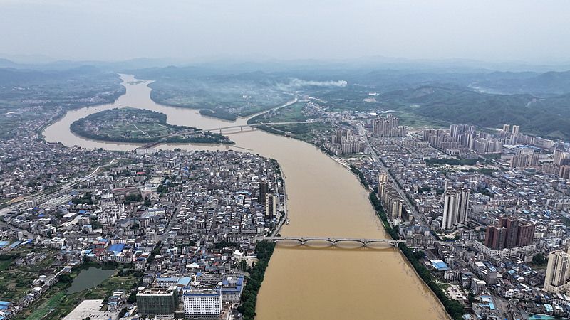 2025年5月24日,广西柳州融安县城段,暴雨过后水位上涨,江水浑浊。