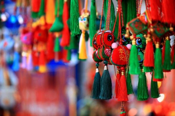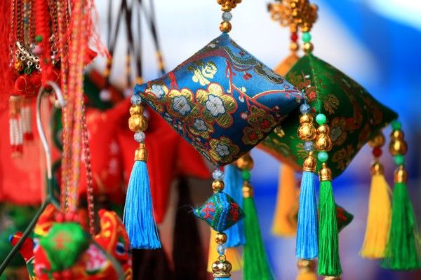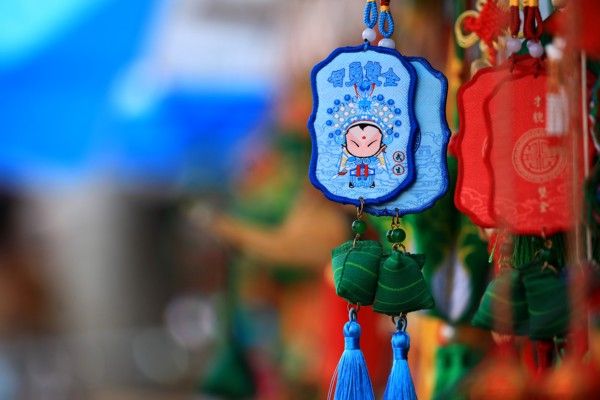 2025年5月25日,江苏省淮安市,街头摊位展示的香包、香囊等端午节民俗纪念物品。随着端午节的临近,江苏省淮安市各大店铺及街头小摊上端午饰品十分畅销。