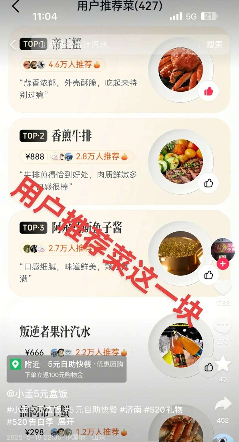 后来,大家像发现新大陆般涌进评论区:“5元自助有帝王蟹吗?”“老板,来份香煎牛排,要七分熟。”