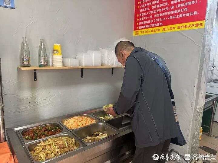 因为手里资金有限,小孟找到了一间每月只要830元租金的门头房。经过核算成本,他把价格压到了最低,最终定价5元一份自助盒饭。闲暇时小孟还拍短视频宣传门店,做线上团购扩大知晓度。