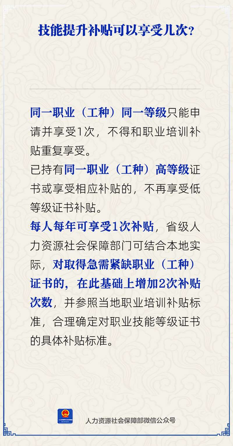 已持有同一职业(工种)高等级证书或享受相应补贴的,不再享受低等级证书补贴。每人每年可享受1次补贴,省级人力资源社会保障部门可结合本地实际,对取得急需紧缺职业(工种)证书的,在此基础上增加2次补贴次数,并参照当地职业培训补贴标准,合理确定对职业技能等级证书的具体补贴标准。