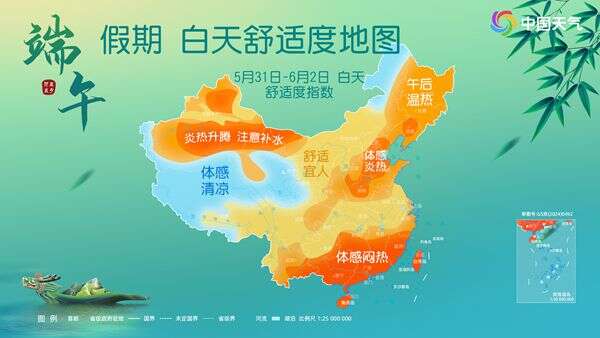 中国天气网 端午假期(5月31日至6月2日)即将到来,各地划龙舟、包粽子等民俗活动陆续展开。今年端午节恰逢“六一”儿童节,亲子游和民俗游热度持续攀升,户外活动备受青睐。那么,各地天气舒适度如何?是否适宜户外活动?