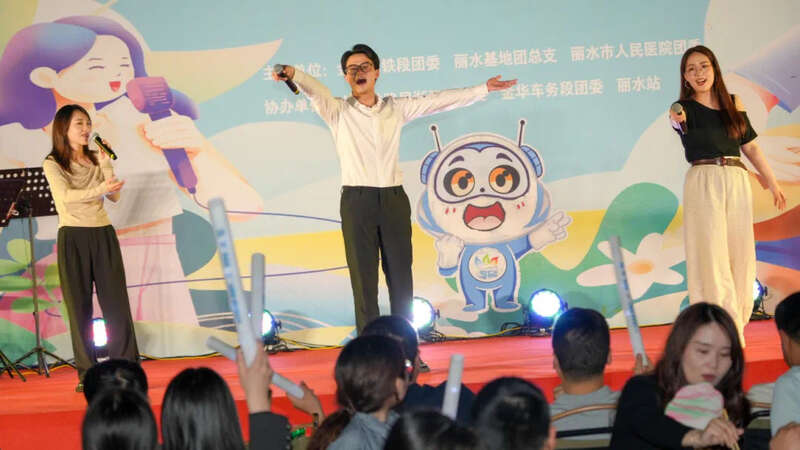 音乐会现场,丽水市人民医院、丽水学院和浙江省内铁路基层站段的青年职工轮番上台,《玫瑰少年》《心动》《就是爱你》《追梦青春》一首首歌曲唱出了青年工友的心声。“青创市集”为在场青年职工精心制作文创产品、非遗漆扇和美食DIY手作,为音乐会增添青春元素与活力氛围。