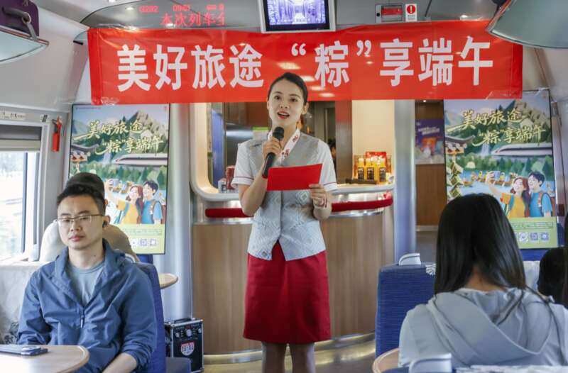 中国青年报客户端讯(翟祚珩 中青报·中青网记者 杨宝光)5月28日,在端午节即将来临之际,中国铁路济南局集团有限公司青岛客运段团委联合山东济铁旅行服务有限公司青岛高铁分公司在青岛开往上海虹桥的G232次列车上举办“美好旅途 ‘粽’享端午”主题活动,乘务人员精心准备亮点纷呈的歌曲和舞蹈,把非遗手作端午荷包和五彩绳送给旅客。