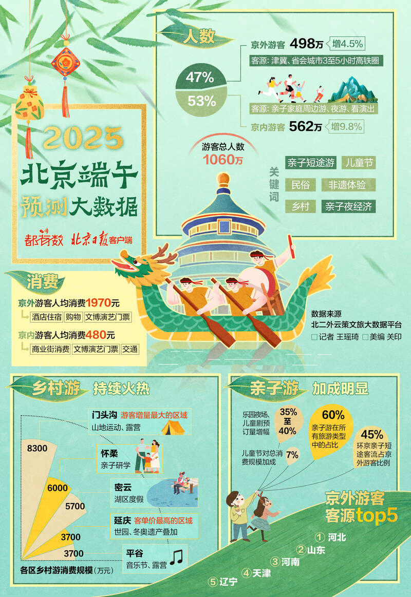 北京第二外国语学院旅游科学学院教授钟栎娜:初步预测,端午在京旅游的人数约为1060万。其中,京内游客占53%,京外游客占47%,主要来自津冀、省会城市3至5小时高铁圈。