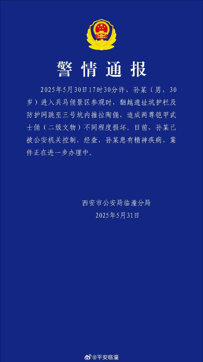 西安警方:进入兵马俑三号坑男子患有精神疾病,已被控制