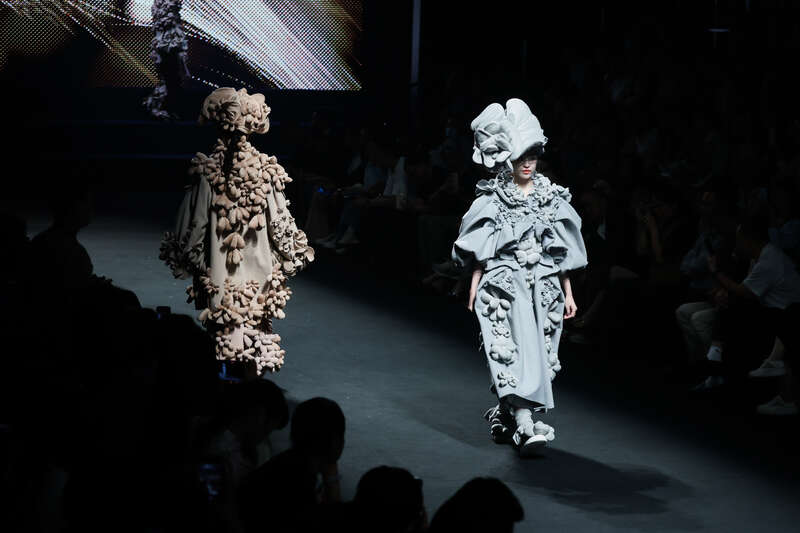 主办方称,此次参与展演的院校几乎都将传统文化和数字应用置于重要位置,新生代设计师们依托数码印花拆解东方美学元素,运用智能材料模拟草木染的生命律动,通过生成式AI与数字渲染技术,为毕设作品定制数字展演场景,使观众在虚实交汇中得以体验别样的视觉盛宴。