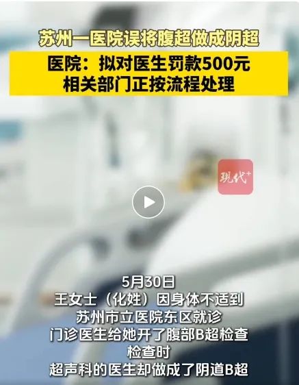 据现代快报报道,近日,王女士因身体不适到苏州一医院就诊,门诊医生给她开了腹部B超检查,不料检查时超声科的医生做成了阴道B超。王女士称,事发后,涉事医生不仅没有立刻正面道歉,还表示“阴超检查更贵”。她投诉后,站在候诊室等了十多分钟后才等来道歉。