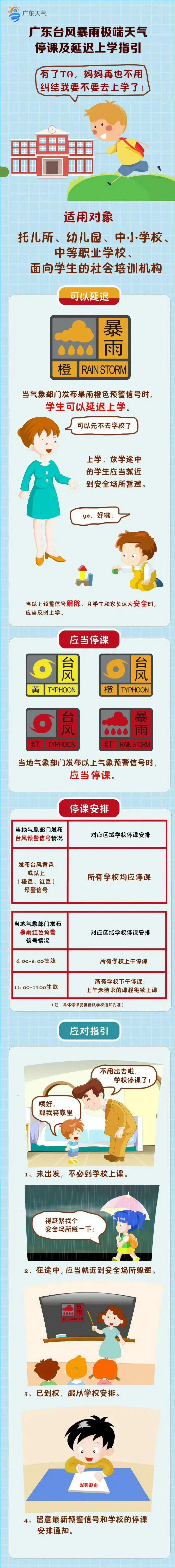 根据《广东省气象灾害防御条例》,当气象部门发布暴雨红色预警信号,可视为停课信号,其生效期间,托儿所、幼儿园、中小学校、中等职业学校应当停课。当暴雨橙色预警生效,学生可以延迟上学,上学、放学途中的学生应当就近到安全场所暂避。
