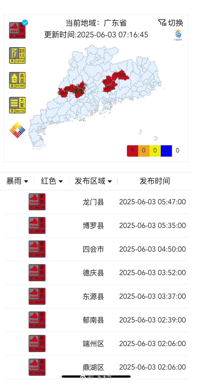 根据广东天气网数据,截至3日7时30分,云浮郁南,肇庆鼎湖、端州、德庆、高要、四会,惠州博罗、龙门,河源东源等县市区,维持发布暴雨红色预警信号;茂名、清远、广州、韶关、梅州、潮州等市,有最高暴雨预警至橙色的县市区;江门、佛山、东莞,有最高暴雨预警至黄色的县市区;茂名、肇庆、江门、广州、韶关、东莞、惠州、河源等市,有最高雷雨大风预警至黄色的县市区。