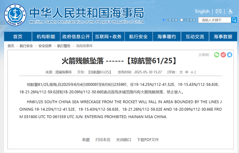据中国海事局网站消息,清澜海事局发布航行警告,6月4日0时至6月6日24时,南海部分海域有火箭残骸掉落,禁止驶入。