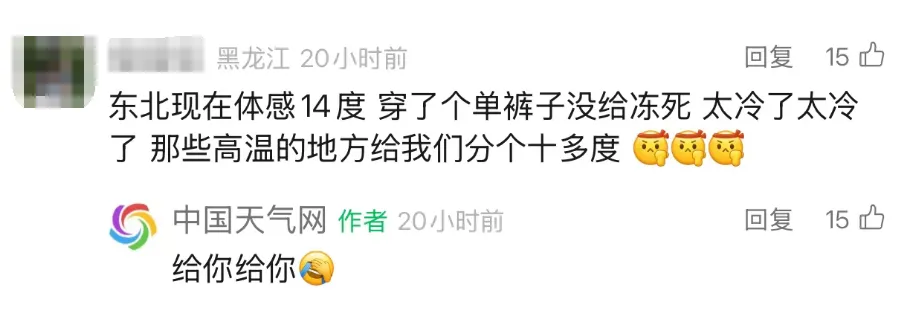 看到华北、黄淮等地那么热,东北的朋友直呼:“太冷了,把气温匀一点给我们吧。”
