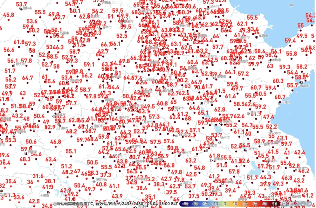 北方的炎热属于典型的干热,光照足、湿度低,猛烈的阳光照射地面使得地表温度升高尤为明显,真有点“炙烤”的感觉。今天12至13时,河北中南部、山西南部、河南北部、山东西部等地地表温度都超过了60℃。