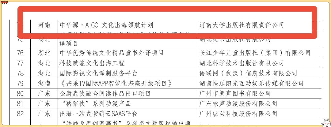此次,全国共遴选出121个重点项目,河南省仅有2个项目入选,我校出版社的“中华源·AIGC文化出海领航计划”能够入选,充分彰显了出版社在中华文化“走出去”方面的可喜表现和巨大潜力,也体现了评审专家对项目在技术创新、内容品质、传播效果等方面的综合认可。这一荣誉的取得,将提升我校出版社在国内外文化出版市场上的影响力,为进一步推动出版走出去、拓展海外市场、讲好中国故事、推动中华文化国际传播奠定坚实基础。