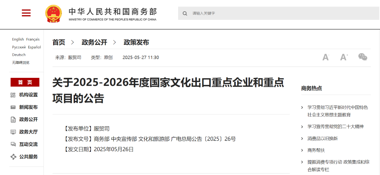据悉,国家文化出口重点项目评选旨在深入贯彻落实党的二十届三中全会精神和党中央、国务院关于推动中华文化“走出去”的决策部署,培育具有国际竞争力的外向型文化企业,推动对外文化贸易高质量发展。根据中央宣传部、外交部、财政部、商务部、文化部、海关总署、税务总局、广电总局、新闻出版总署、国务院新闻办2012年第3号公告(《文化产品和服务出口指导目录》),经企业申报、省市初审、第三方专业机构合规性审核、专家评审、有关部门复核等程序,商务部、中央宣传部、文化和旅游部、广电总局共同认定了2025—2026年度国家文化出口重点企业和2025—2026年度国家文化出口重点项目。
