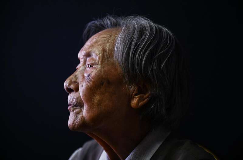 ↑2017年12月13日,夏淑琴(左一)在南京大屠杀死难者国家公祭仪式现场。