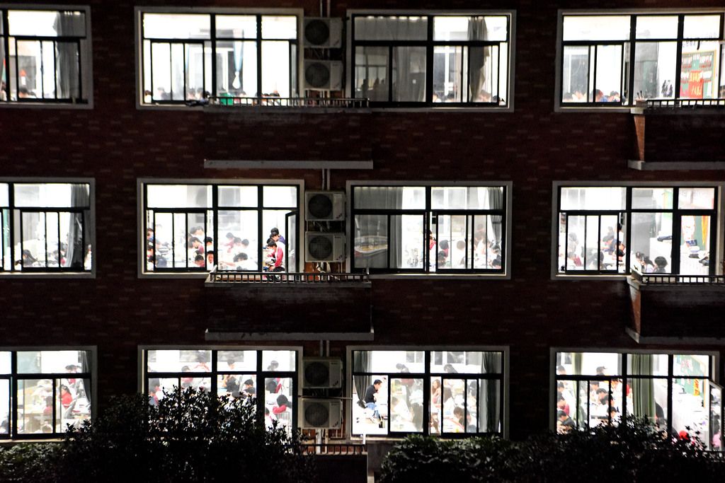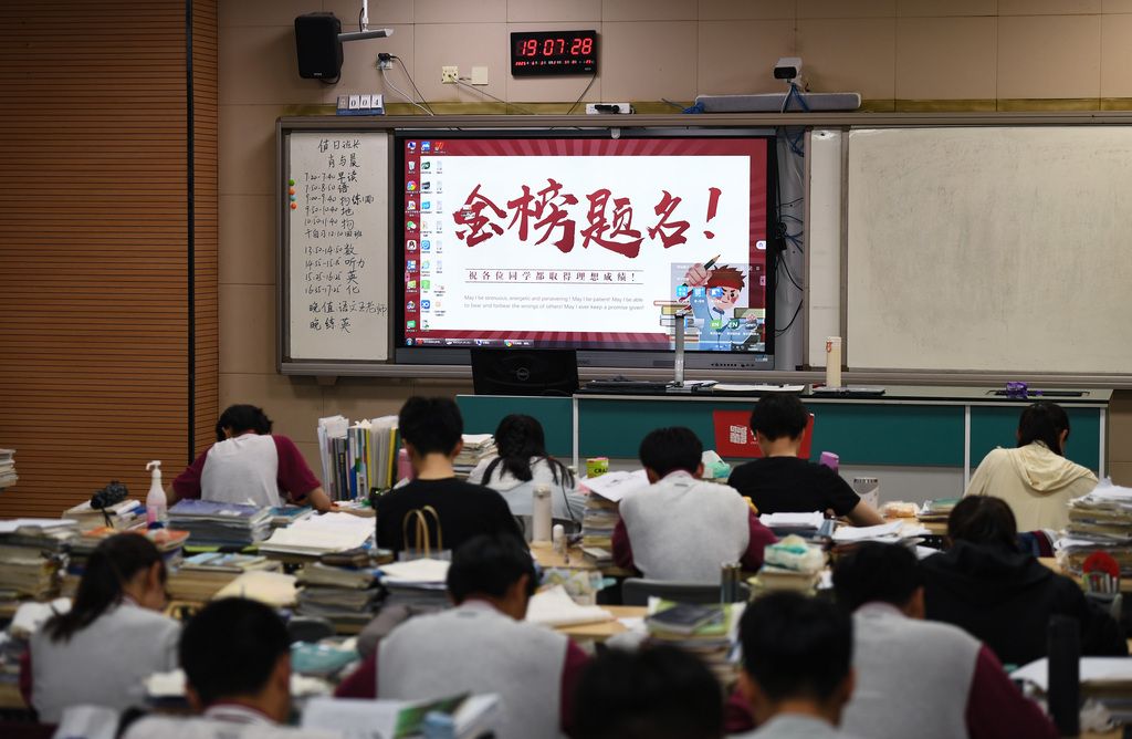 2025年6月3日,安徽淮南二中,高三学生在教室里认真完成高中阶段最后一堂晚自习课,自信迎高考。