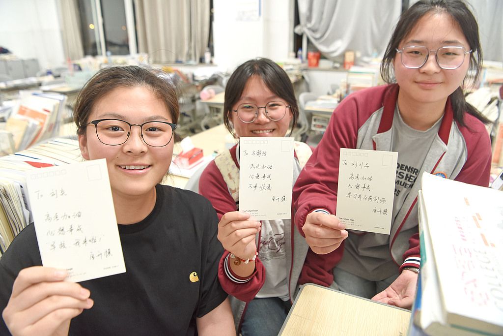 2025年6月3日,安徽淮南二中,高三学生最后一堂晚自习课后,展示老师赠送的高考祝福卡片,以平常心自信迎接高考。