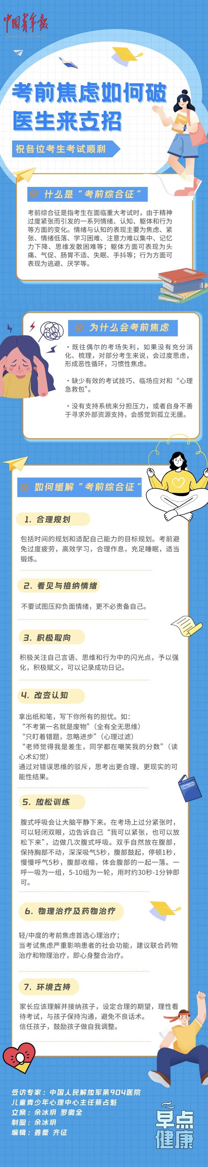 2025年全国高考即将拉开帷幕,大考前,总有考生出现过度的焦虑反应,影响正常发挥。考前焦虑如何破?医生给出了应对“考前综合征”的心理调节方法,一图了解。