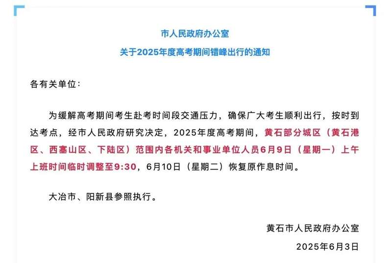 6月3日,湖北省黄石市人民政府办发布通知称,今年高考期间,黄石部分城区(黄石港区、西塞山区、下陆区)范围内各机关和事业单位人员6月9日(星期一)上午上班时间临时调整至9:30,大冶市、阳新县参照执行。