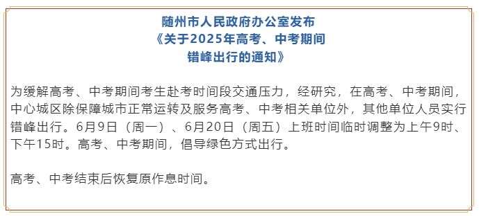 3日,湖北省随州市人民政府办公室发布通知,在高考、中考期间,中心城区除保障城市正常运转及服务高考、中考相关单位外,其他单位人员实行错峰出行。6月9日(周一)、6月20日(周五)上班时间临时调整为上午9时、下午15时。高考、中考期间,倡导绿色方式出行。高考、中考结束后恢复原作息时间。