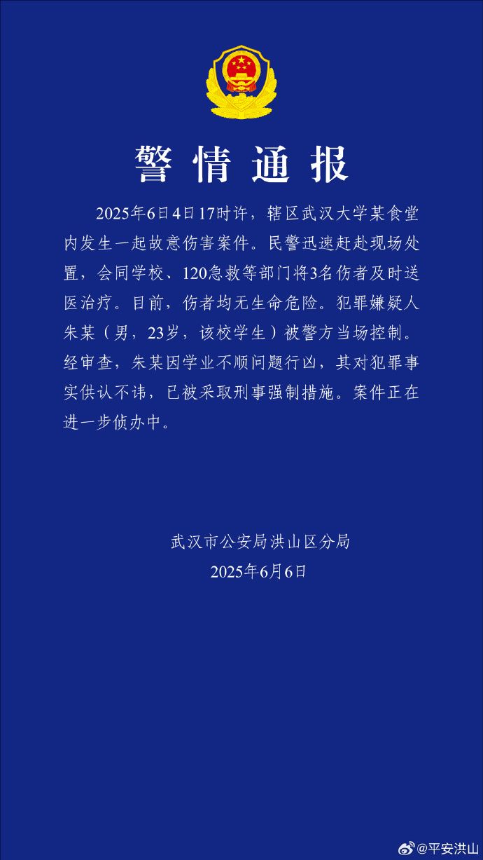 武汉警方通报武大故意伤害案件:嫌犯被采取刑事强制措施