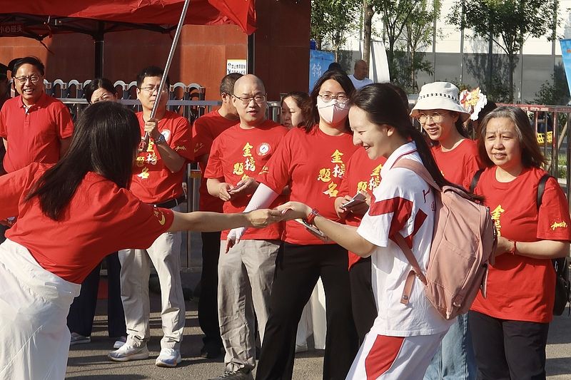 2025年6月7日,北京,中国人民大学附中通州校区考点,老师穿着“金榜题名”红色文化衫列队夹道欢迎考生入场。当日,2025全国高考开始。