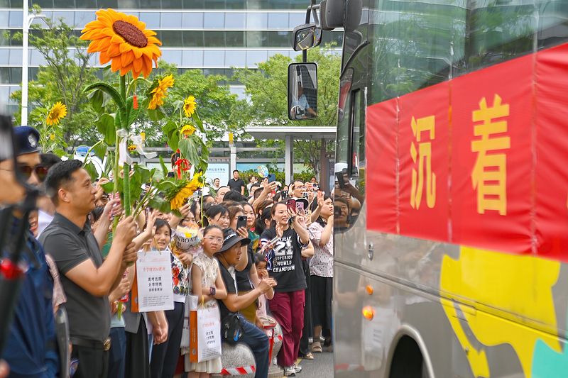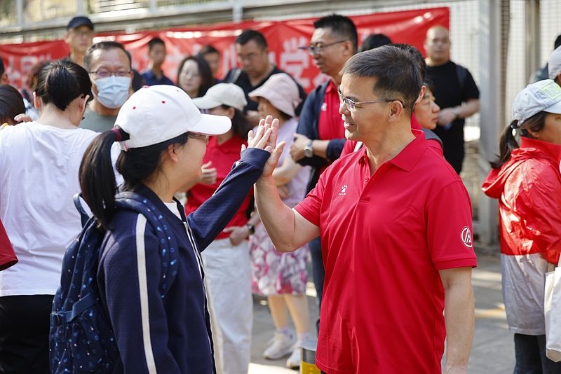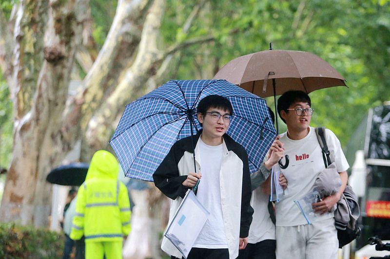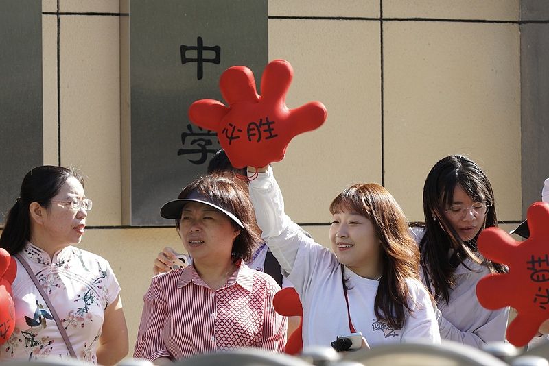 2025年6月7日,江苏宿迁,在宿迁中学考点外,家长欢送考生进入考场。