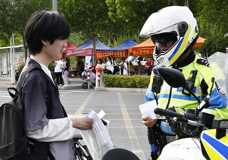 2025年6月7日,山东枣庄,一名骑警在枣庄市第十八中学考点帮助考生取回忘带的准考证。