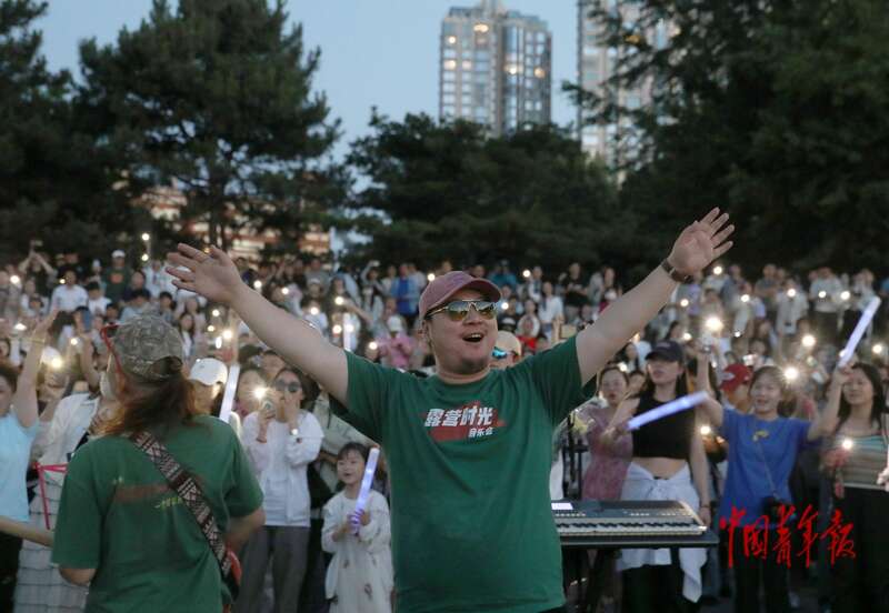 6月2日,北京朝阳公园一处露天广场,一位年轻的歌手挥舞双手向观众致意。当日傍晚,一场夏日露天广场音乐会在这里举行。中青报·中青网记者 陈剑/摄