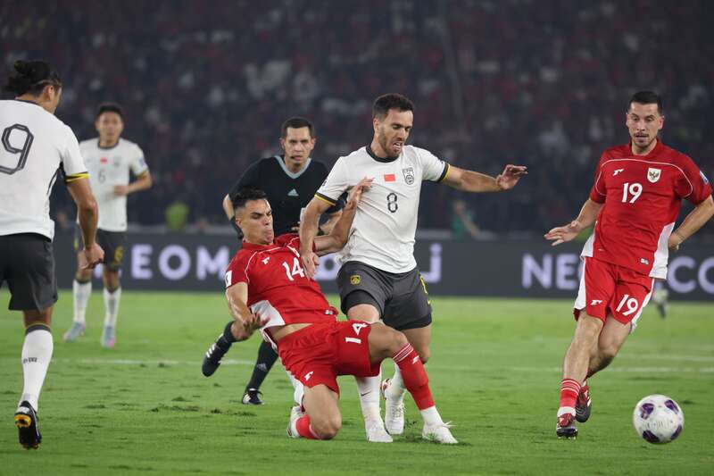 当地时间6月5日,印度尼西亚雅加达格罗拉蓬卡诺体育场,2026年世界杯亚洲区预选赛18强赛C组第九轮中国队客场对阵印度尼西亚队的比赛中,印尼队球员试图从后方铲断进球,对中国队8号塞尔吉尼奥进行防守。本场比赛中国队0-1不敌印尼队,以2胜7负的战绩位居小组最后一位,提前一轮无缘2026年美加墨世界杯。杨逸凡/摄