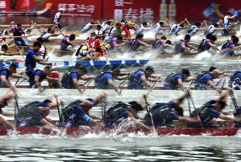 5月31日,福建福州,2025福州国际龙舟邀请赛暨“一带一路”青年龙舟国际邀请赛决赛,参赛龙舟队在竞逐中。当日是端午节。视觉中国供图