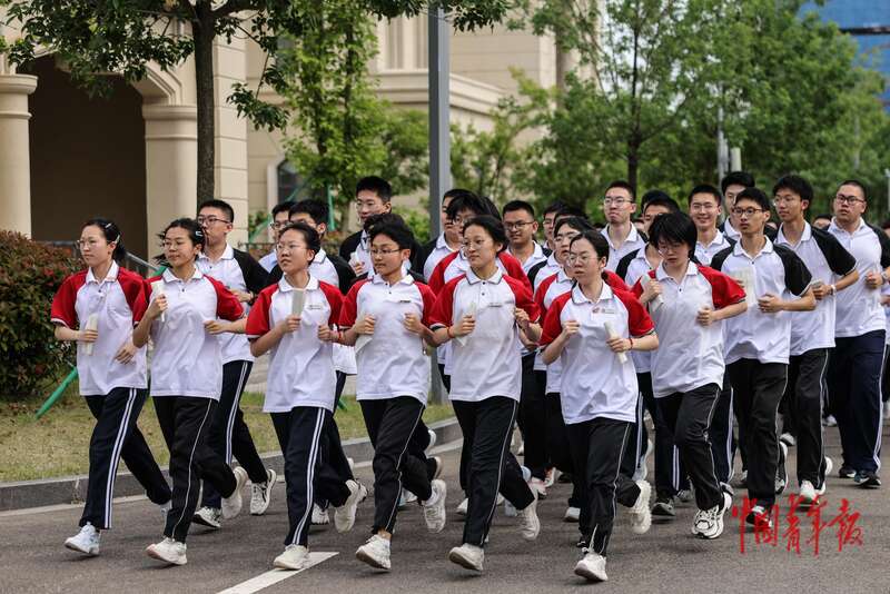 6月2日,山东威海,荣成三中,下午大课间跑操时,高三学生手中都握着复习资料,准备在跑操后老师讲话前后的碎片时间抓紧复习。2025年全国高考于6月7日拉开帷幕。中青报·中青网记者 曲俊燕/摄