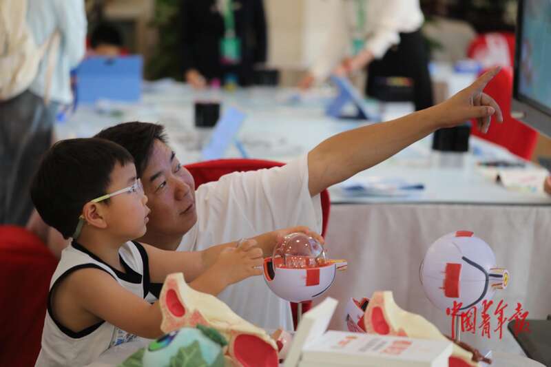 6月6日,北京梅地亚中心,2025年全国“爱眼日”主场活动上,一名小朋友在父亲的讲解下了解眼部健康知识。中青报·中青网记者 孔斯琪/摄