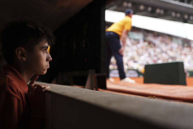 当地时间6月1日,法国巴黎罗兰加洛斯体育场,法国网球公开赛第四轮中国选手郑钦文与俄罗斯选手柳德米拉·萨姆索诺娃的比赛中,一名球童在场边专注地观看比赛。视觉中国供图