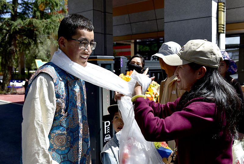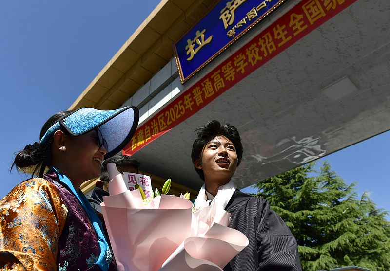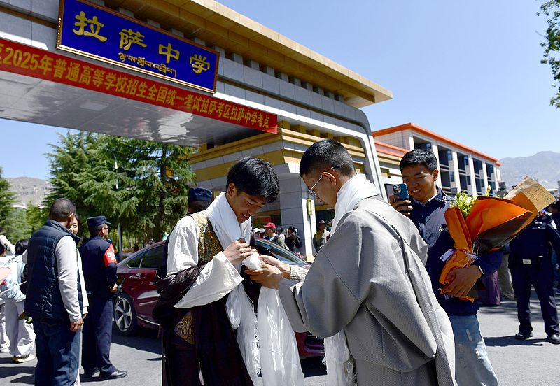 2025年6月9日上午,西藏自治区2025年普通高考完成所有科目考试。家长在西藏拉萨中学考点外为结束考试的孩子献哈达。