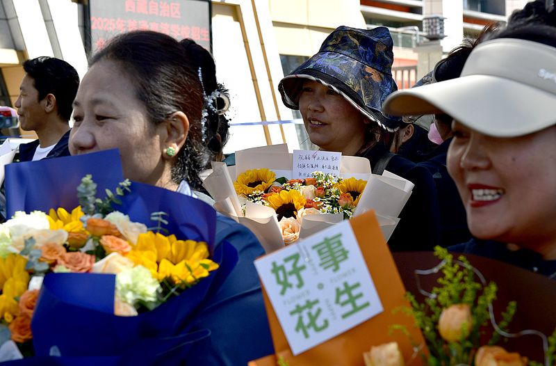 2025年6月9日上午,西藏自治区2025年普通高考完成所有科目考试。家长在西藏拉萨中学考点外为结束考试的孩子献鲜花。
