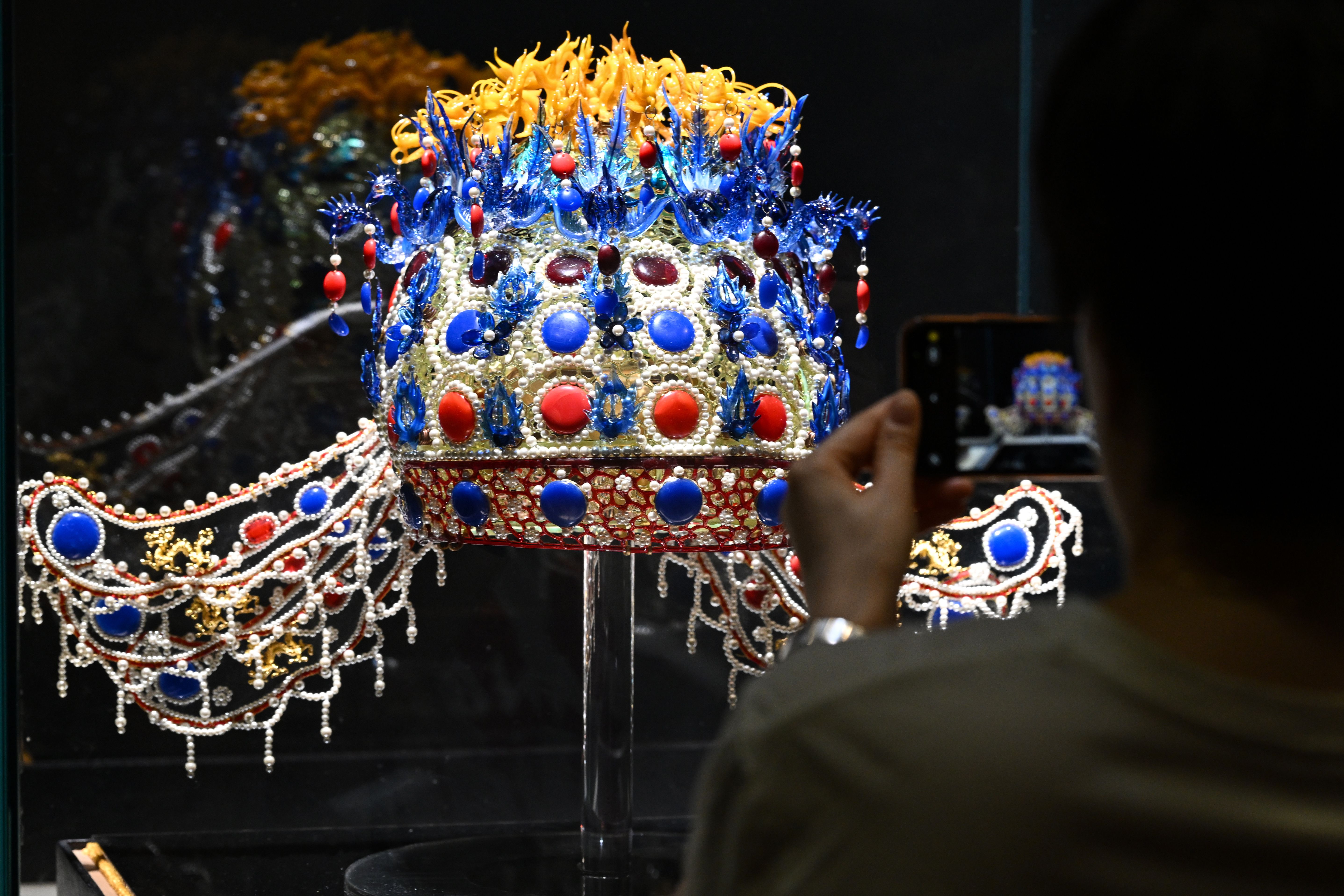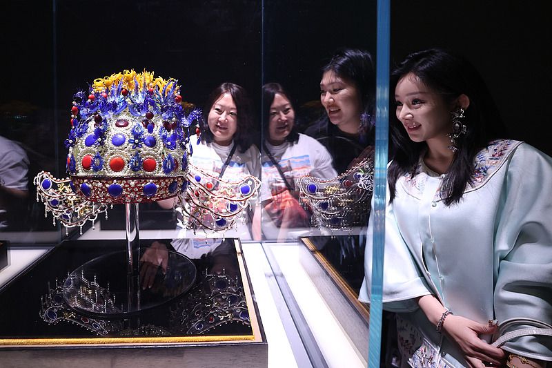 2025年6月10日,北京,中国国家博物馆,观众在琉光璃彩——淄博琉璃艺术展上观赏作品《琉璃凤冠》。