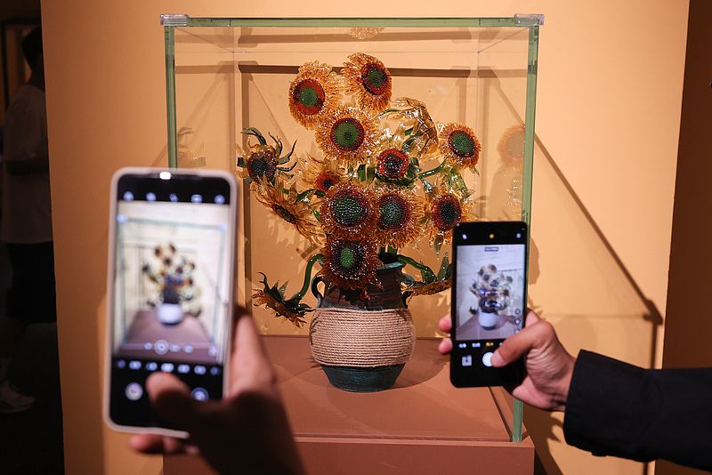 2025年6月10日,北京,中国国家博物馆,观众在琉光璃彩——淄博琉璃艺术展上拍摄作品《暖光里葵语》。